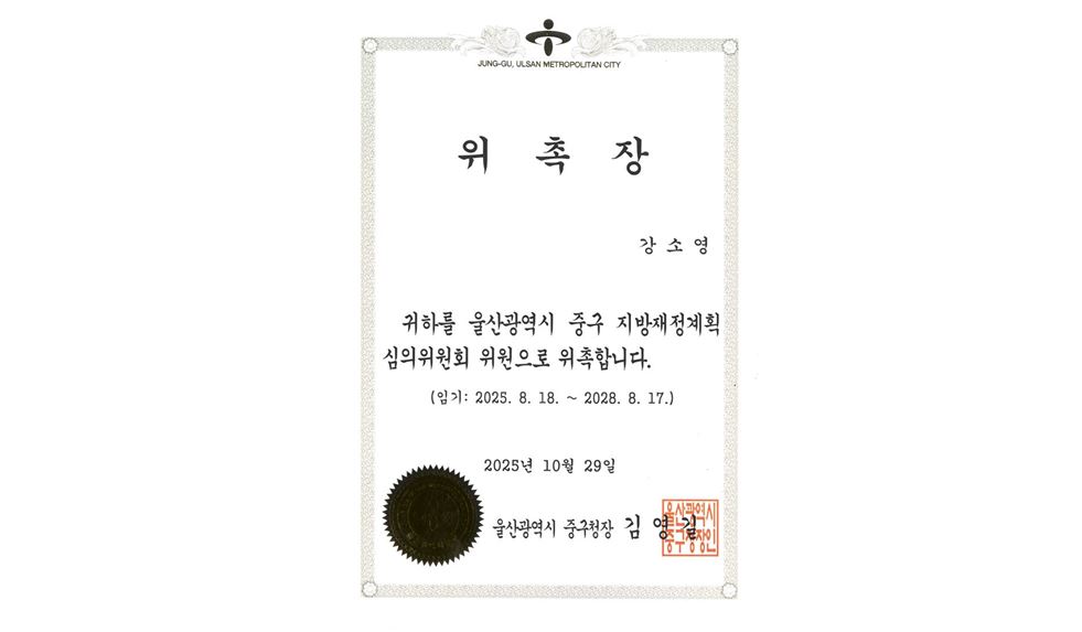 강소영 변호사 울산광역시 중구 지방재정계획심의위원회 위원 재위촉